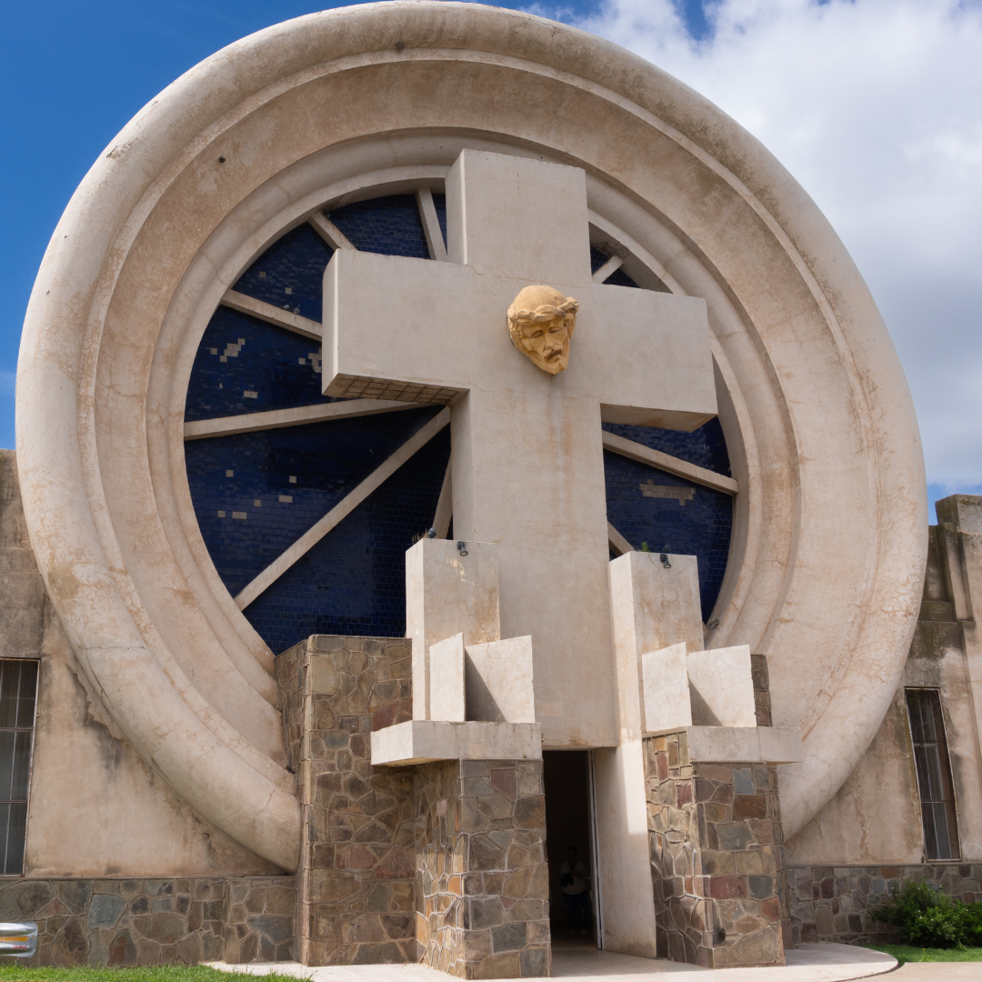 Portal del cementerio de Saldungaray: un disco de casi veinte metros con la cabeza de Cristo que parece vigilarlo todo.